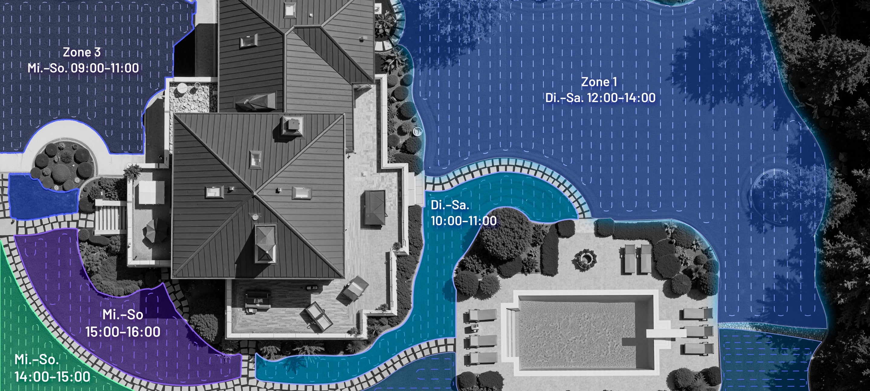 Unterstützt bis zu 10 getrennte Mähzonen mit individuellen Zeitplänen – ideal für Gärten mit mehreren Rasenflächen, Terrassen oder Segmenten.