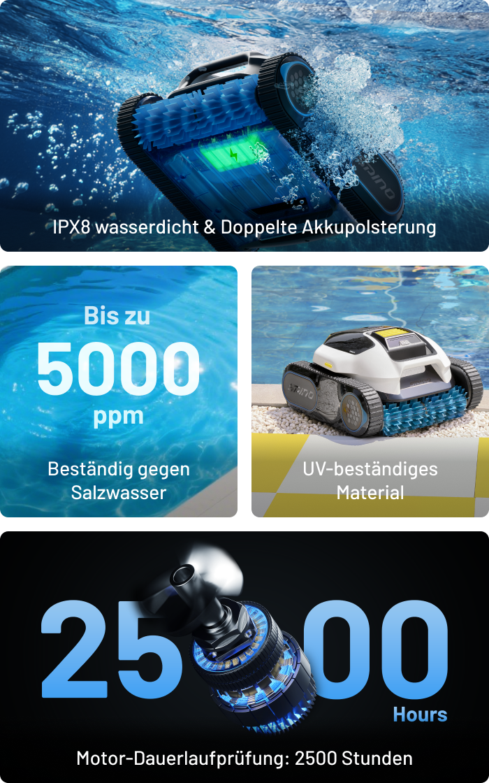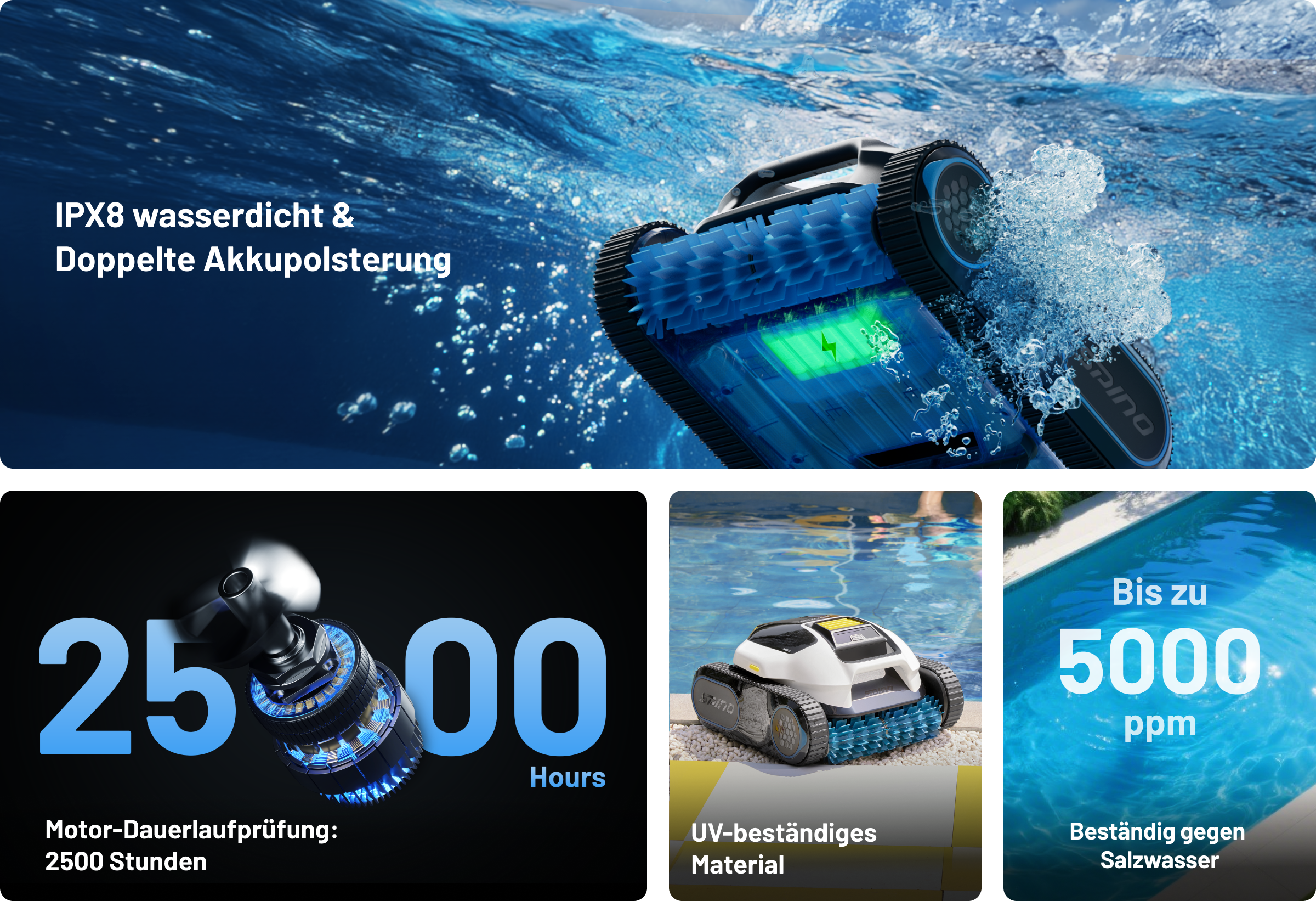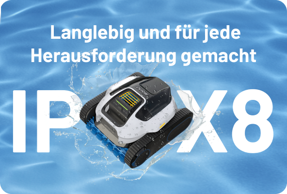 Gründliche Reinigung der Poolwände mit bis zu 180 Minuten Laufzeit.