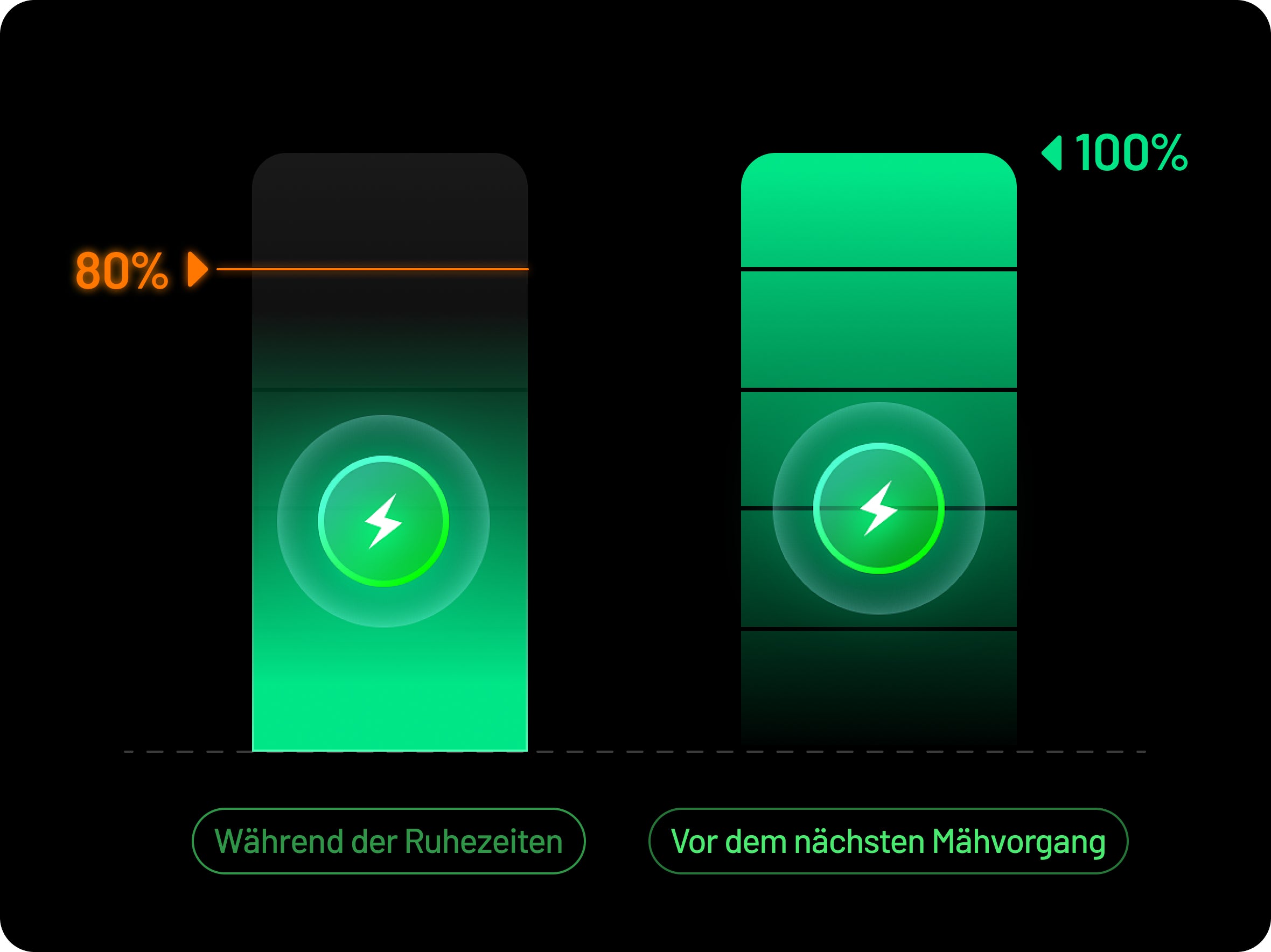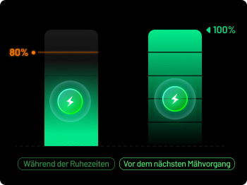 Optimieren Sie das Laden ganz nach Bedarf: Legen Sie ein individuelles Limit (z.B. 80 %) fest, um die Lebensdauer der Batterie zu verlängern, und planen Sie Ladevorgänge zu Tageszeiten, an welchen der Rasenmähroboter zu günstigeren Tarifen lädt - für einen smarten und kosteneffizienteren Betrieb.