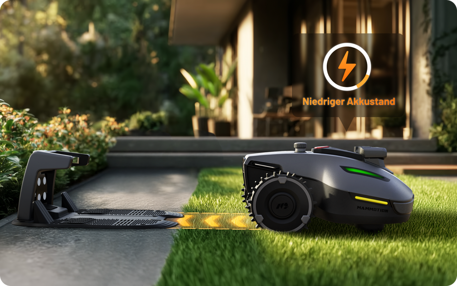 Wenn der Akkustand niedrig ist, kehrt der YUKA mini Vision automatisch zur Ladestation zurück, um sich aufzuladen. So müssen Sie sich keine Sorgen machen, dass der Mäher während des Betriebs stehen bleibt.